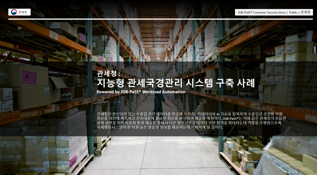 신속대응에 필요한 정보를 분석하여 제공할 예정이다. JOB-PaSS®는 이와 같은 관세청의 중요한 과제 실현을 위한 자동화 환경 제공을 통해서
