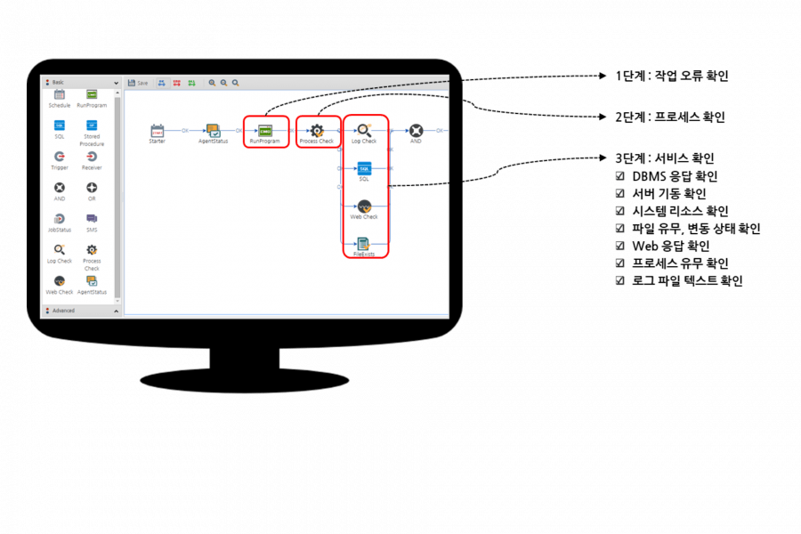 운영 프로세스의 정지, 기동시 필수 확인 내용을 절차화하도록 다양한 검증 컴포넌트를 제공하여 효율적인 검증 자동화합니다.