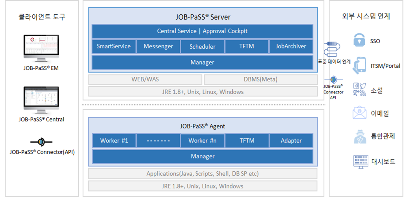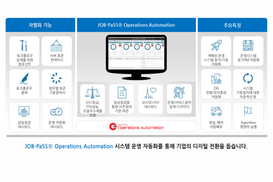 JOB-PaSS® Operations Automation은 IT 조직의 복잡성이 증가함에 따라 발생하는 비효율에 의한 예산 낭비를 최소화하고 많은 작업을 자동화하여 비즈니스 변화에 보다 능동적으로 대처할 수 있는 표준화된 프로세스를 제공합니다.